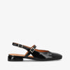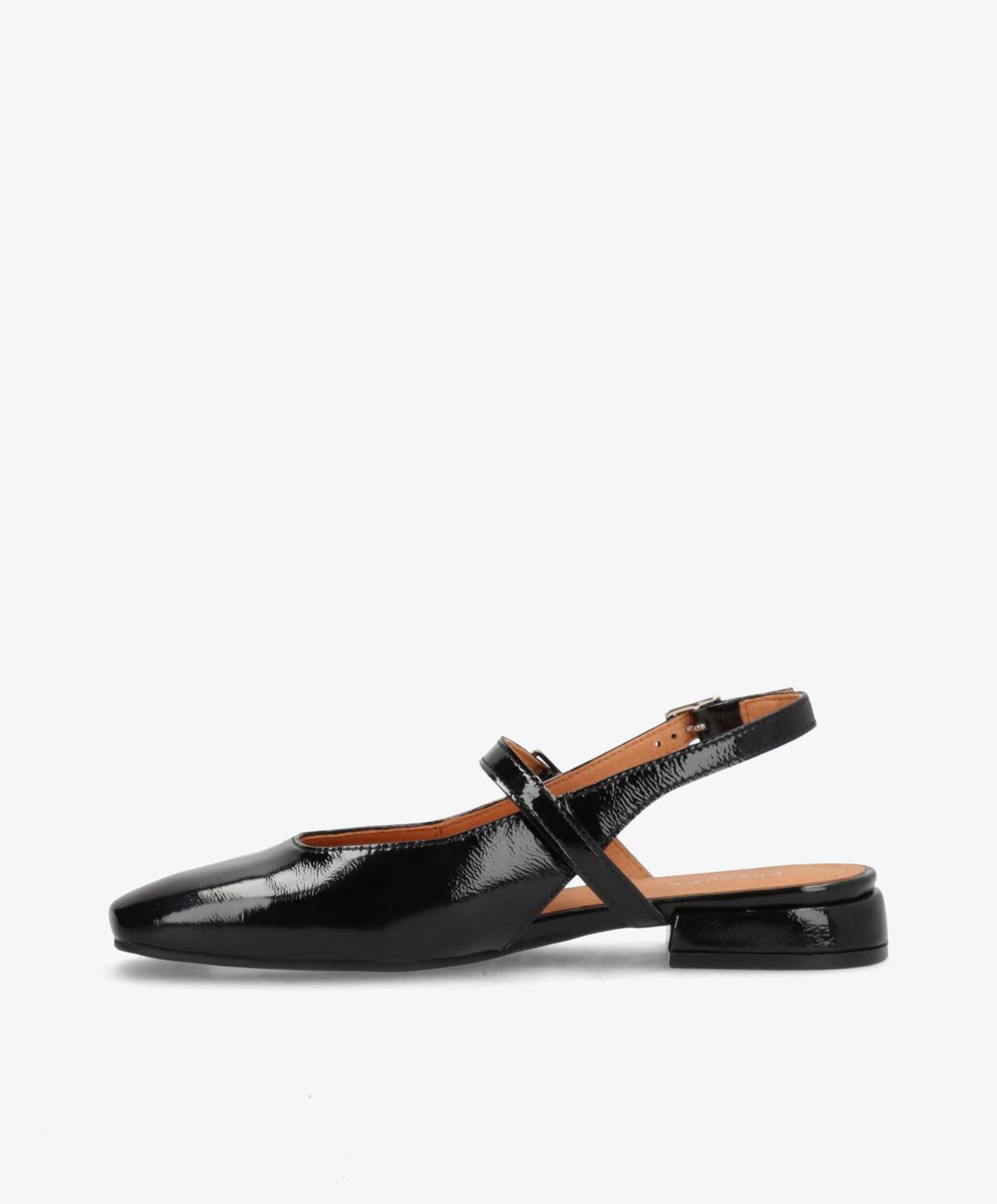 ASCEND P er en elegant slingback-sko i skinnende sort lak, der kombinerer klassisk femininitet med moderne detaljer. Den bløde rundede snude, de fine spænder i sølv og den lave hæl skaber et stilsikkert udtryk, der både er let og sofistikeret. Det skinnende læder giver skoen et eksklusivt touch, som nemt løfter dit outfit – uanset om det er til hverdag eller fest.