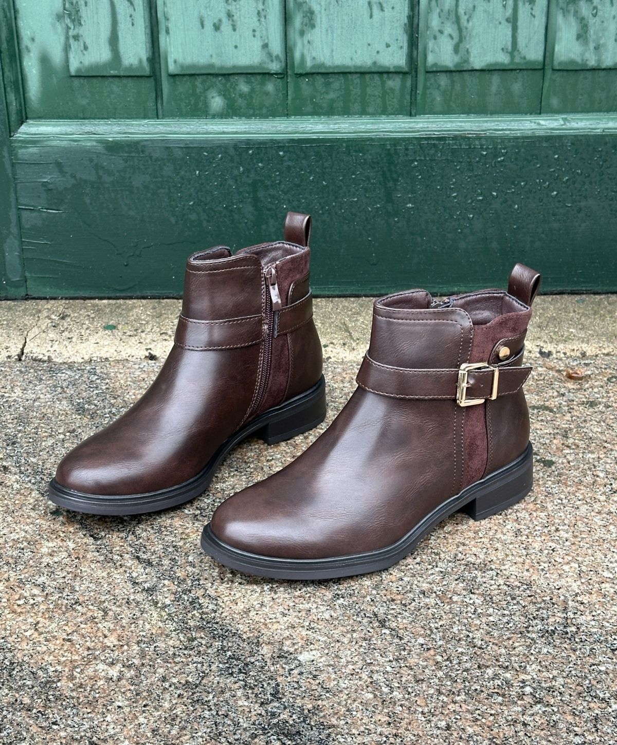 BEA er en klassisk og stilren ankelstøvle i mørkebrun imiteret skind, perfekt til dig der ønsker et tidløst look med et feminint touch. Den gyldne spænde og kontrast i ruskindslook på skaftet tilføjer eksklusive detaljer, som løfter designet.