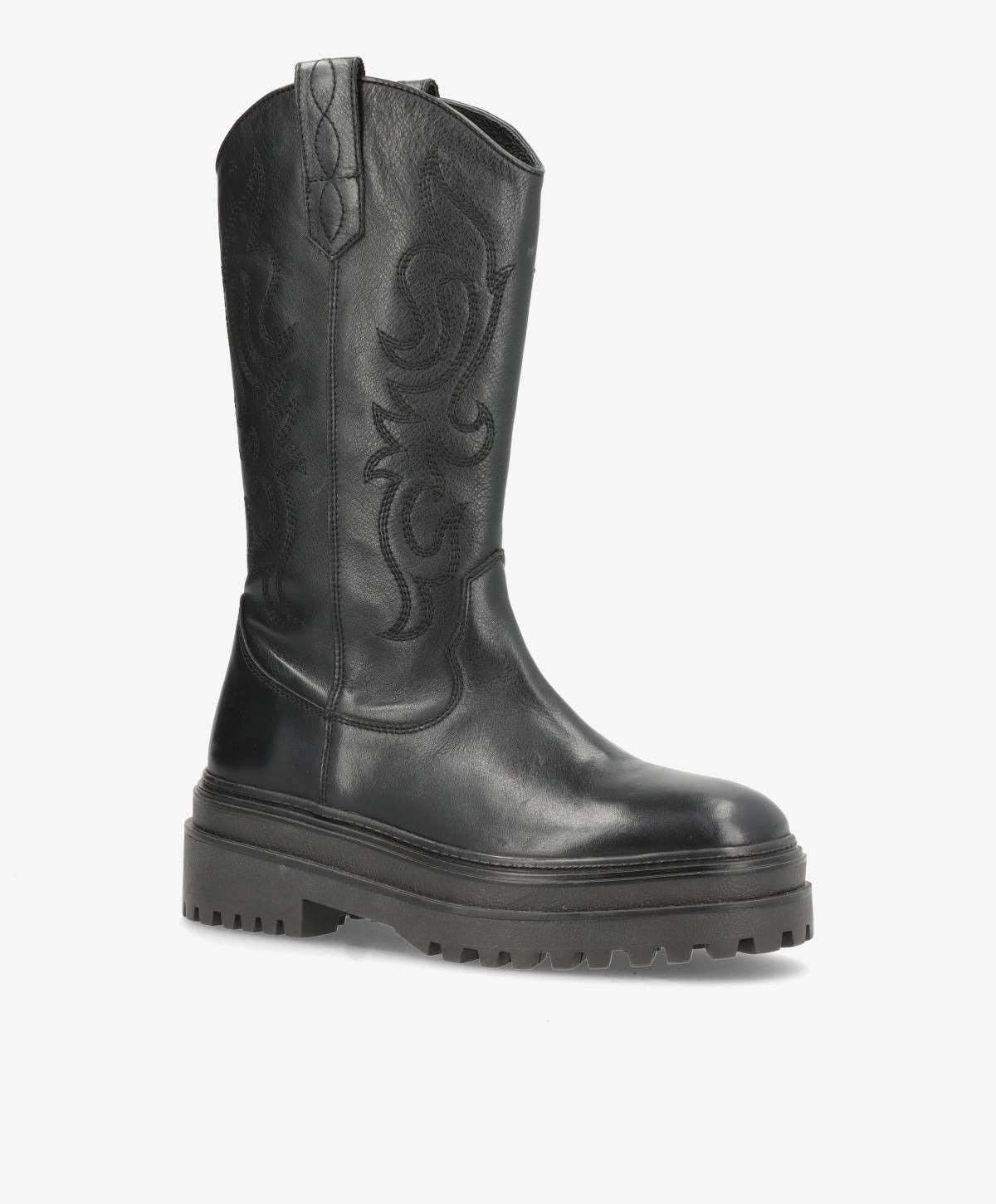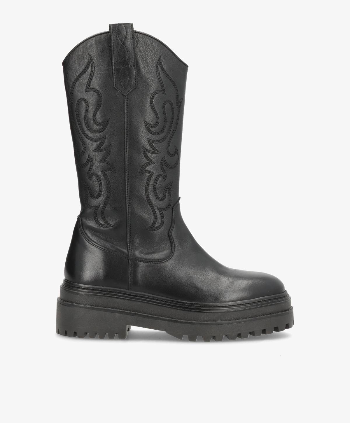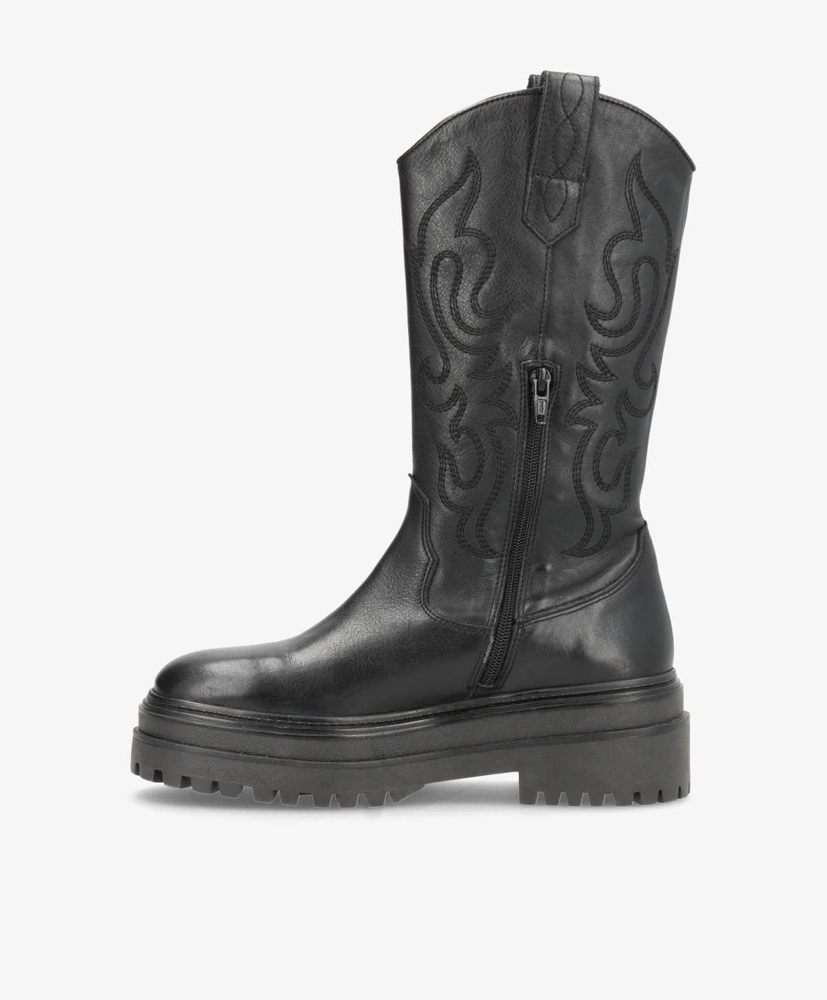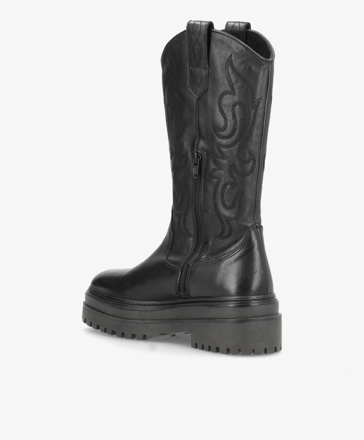 De lækreste cowboy boots fra phenumb i en klassisk sort med syninger. Støvlerne har det perfekte mix af westernlook krydret med et cool biker element fra den grove sål. Netop den chunky sål er med til at løfte samtidig med, at den byder på utrolig komfort. De lækre boots runder foroven og er derfor nemme at påføre sammen med en diskret lynlås på siden.