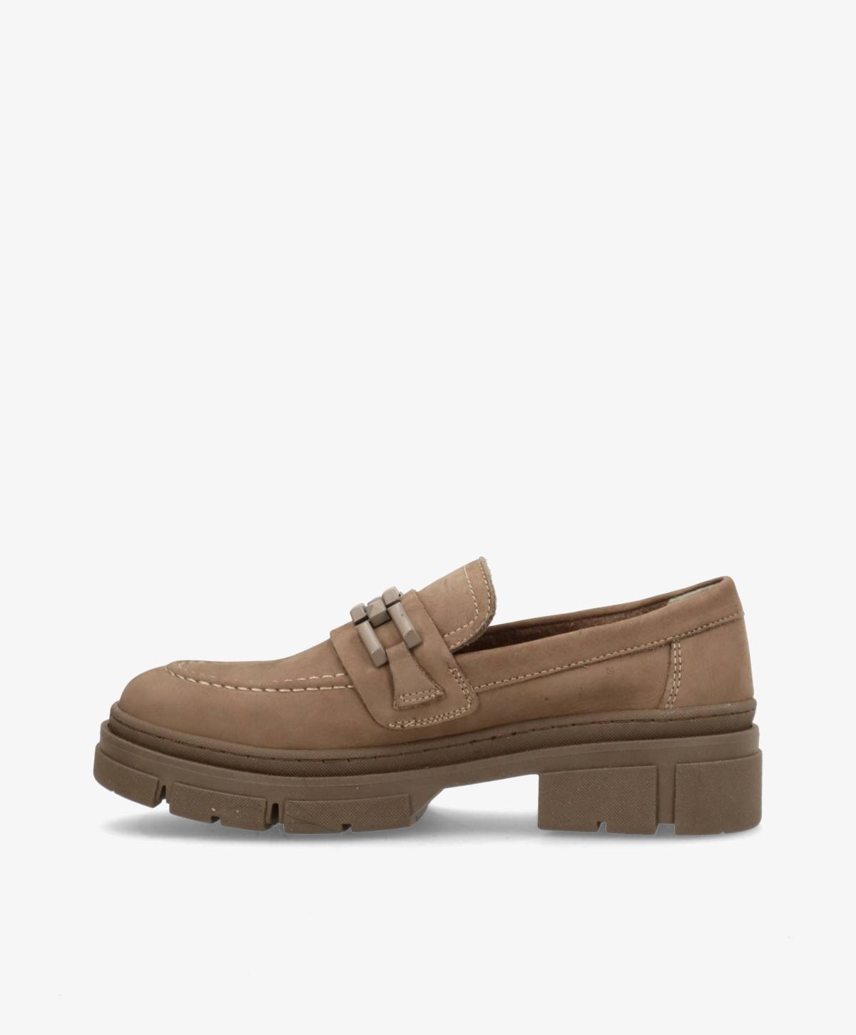Supersval och chunky lastare i brunt. Skon har en tjock botten vilket ger den ett modernt utseende. En kedja har lagts till ovanför foten. Skon har en mjuk och skön innersula, vilket gör den bekväm att gå i under längre tid.