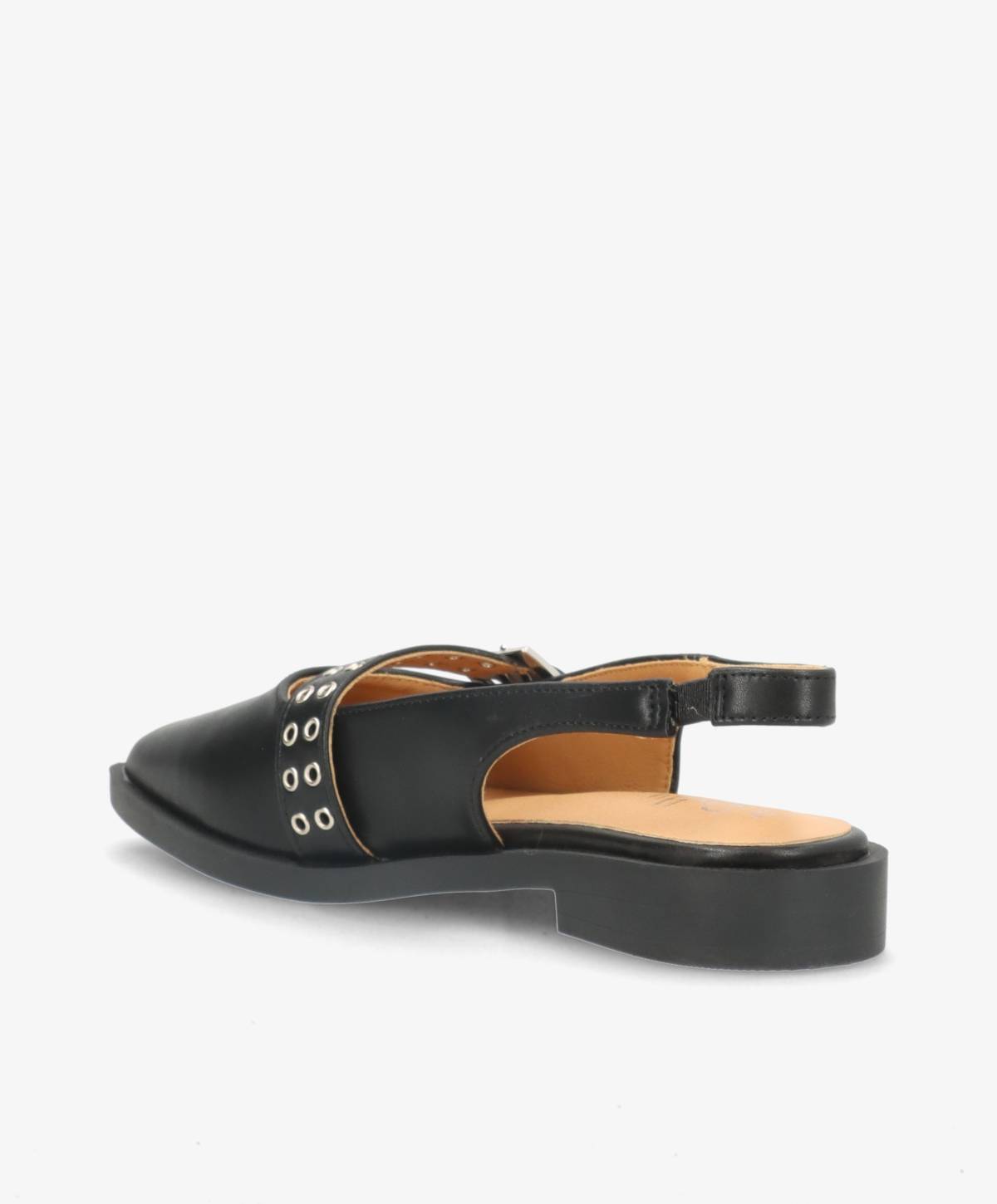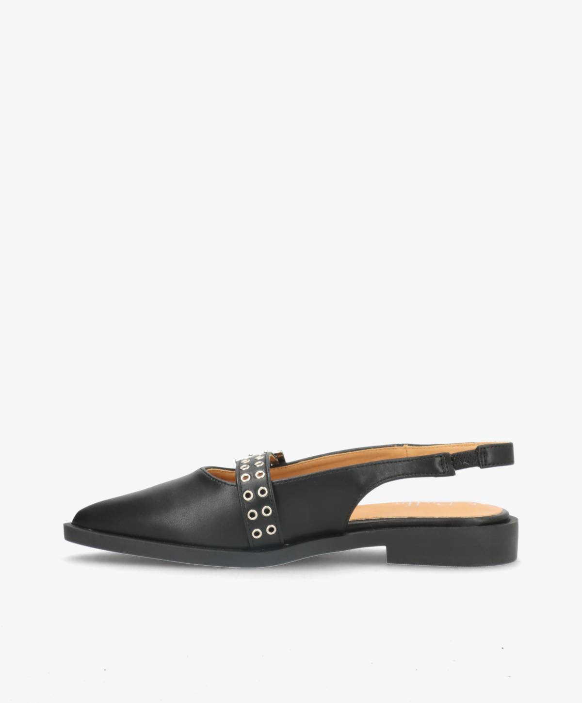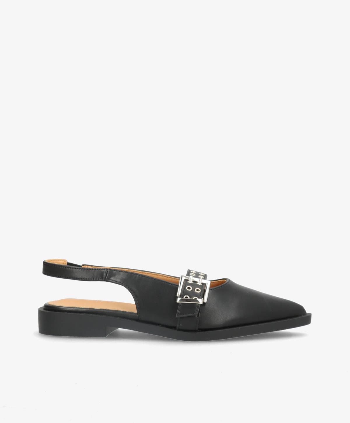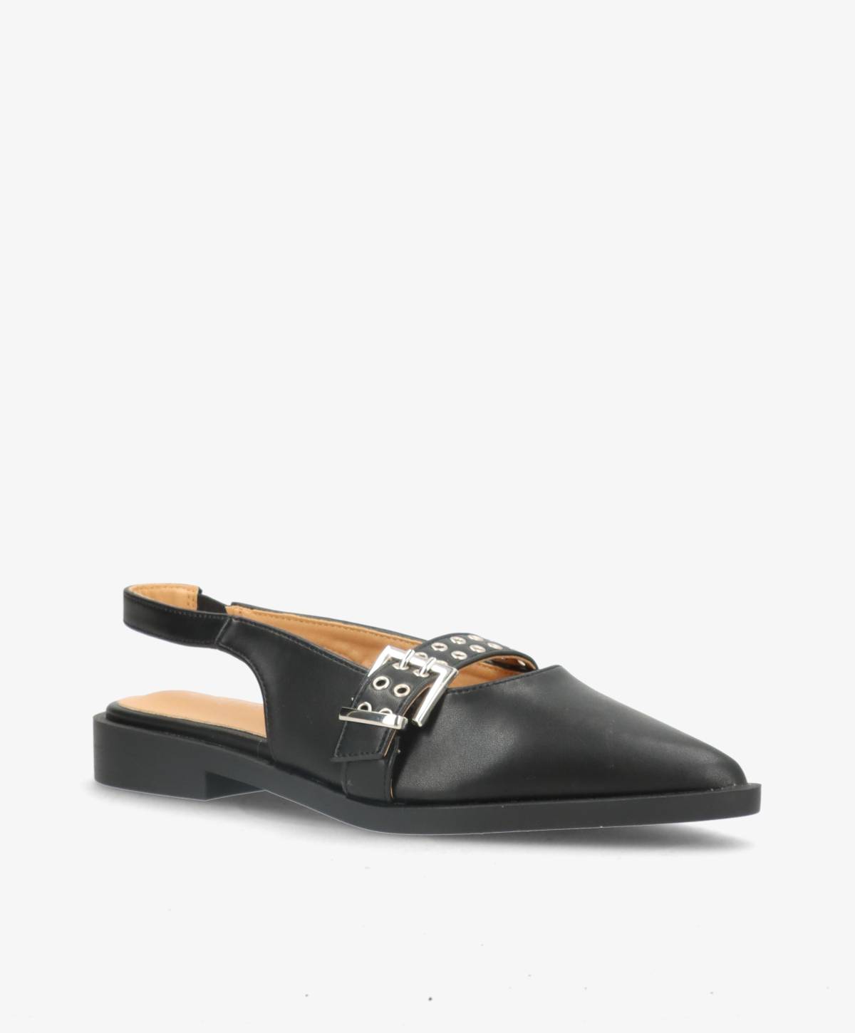 FAYE fra Duffy er en moderne fortolkning af den klassiske ballerina. Det spidse snit og den slingback-inspirerede rem giver skoen et elegant og feminint udtryk, mens den markante spænde-detalje med nitter tilfører et edgy twist. Det sorte, bløde materiale sikrer et tidløst look, der nemt kan styles til både hverdag og fest.