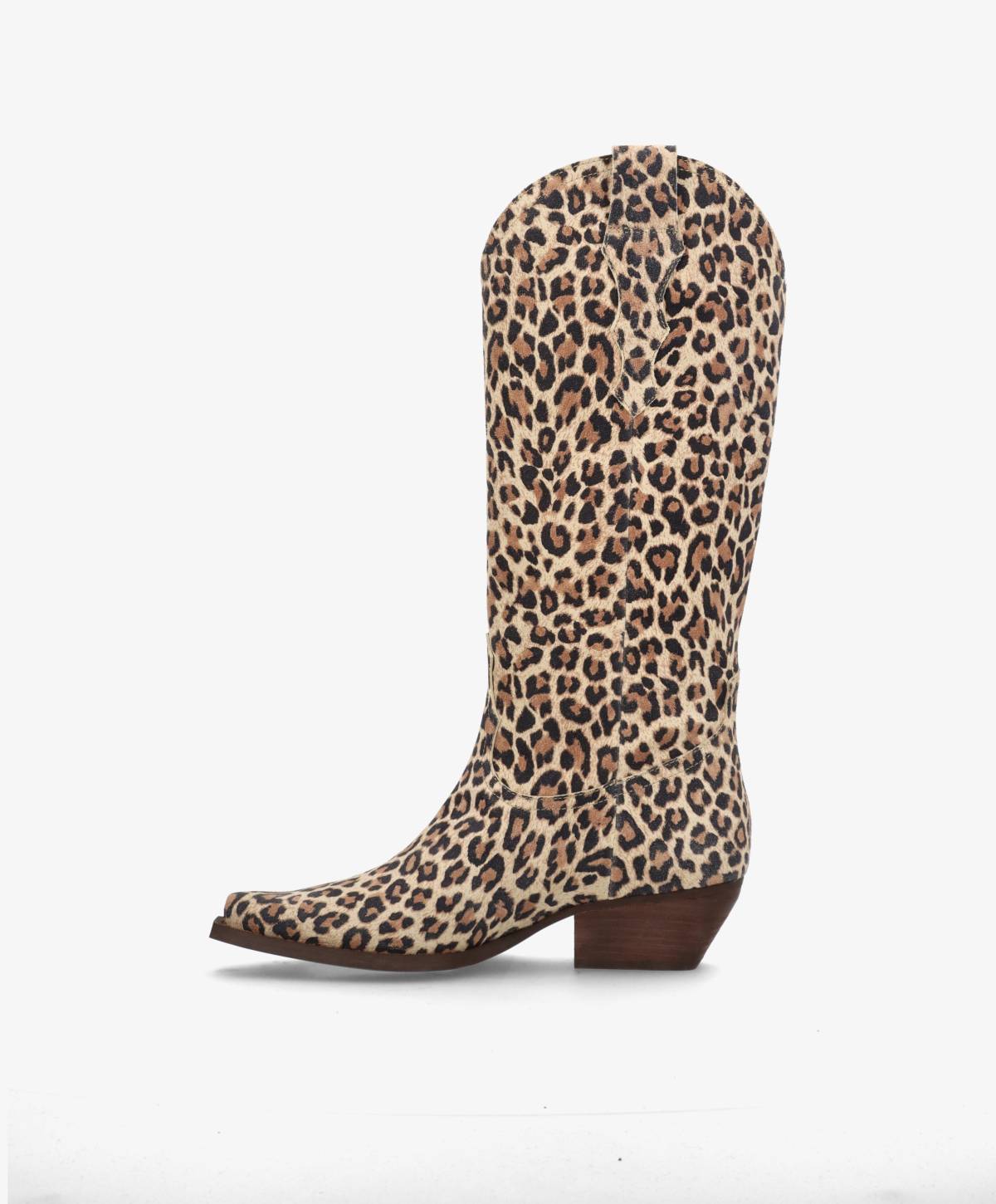 Gør et indtryk med de vildt smukke FRANKIE cowboy støvler i leopard ruskind. Med deres unikke design og karakteristiske mønster er disse støvler et absolut must-have til garderoben for enhver modebevidst. De er designet med en skarp, spids snude og en lav hæl, der giver et trendy og selvsikkert udtryk.