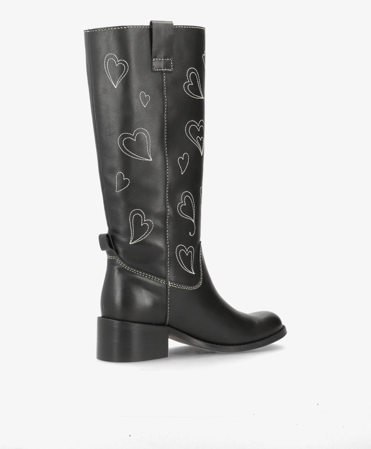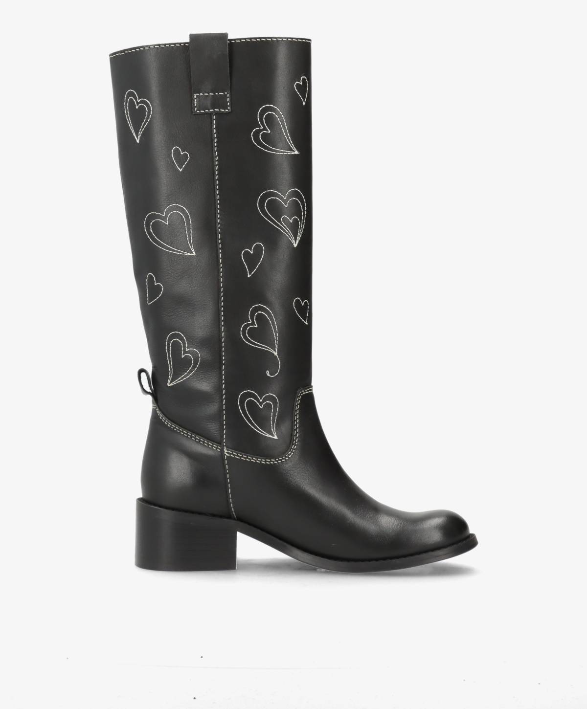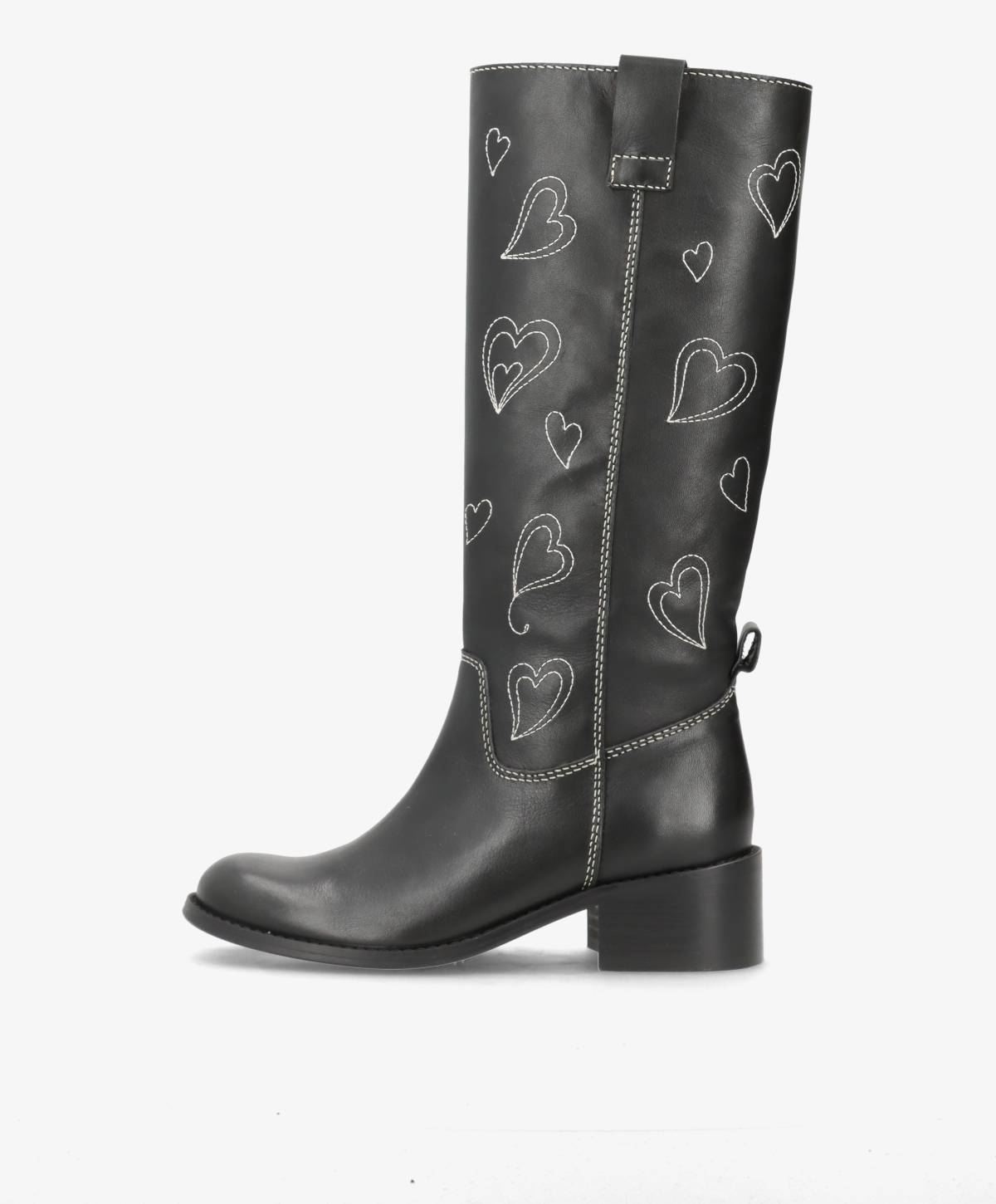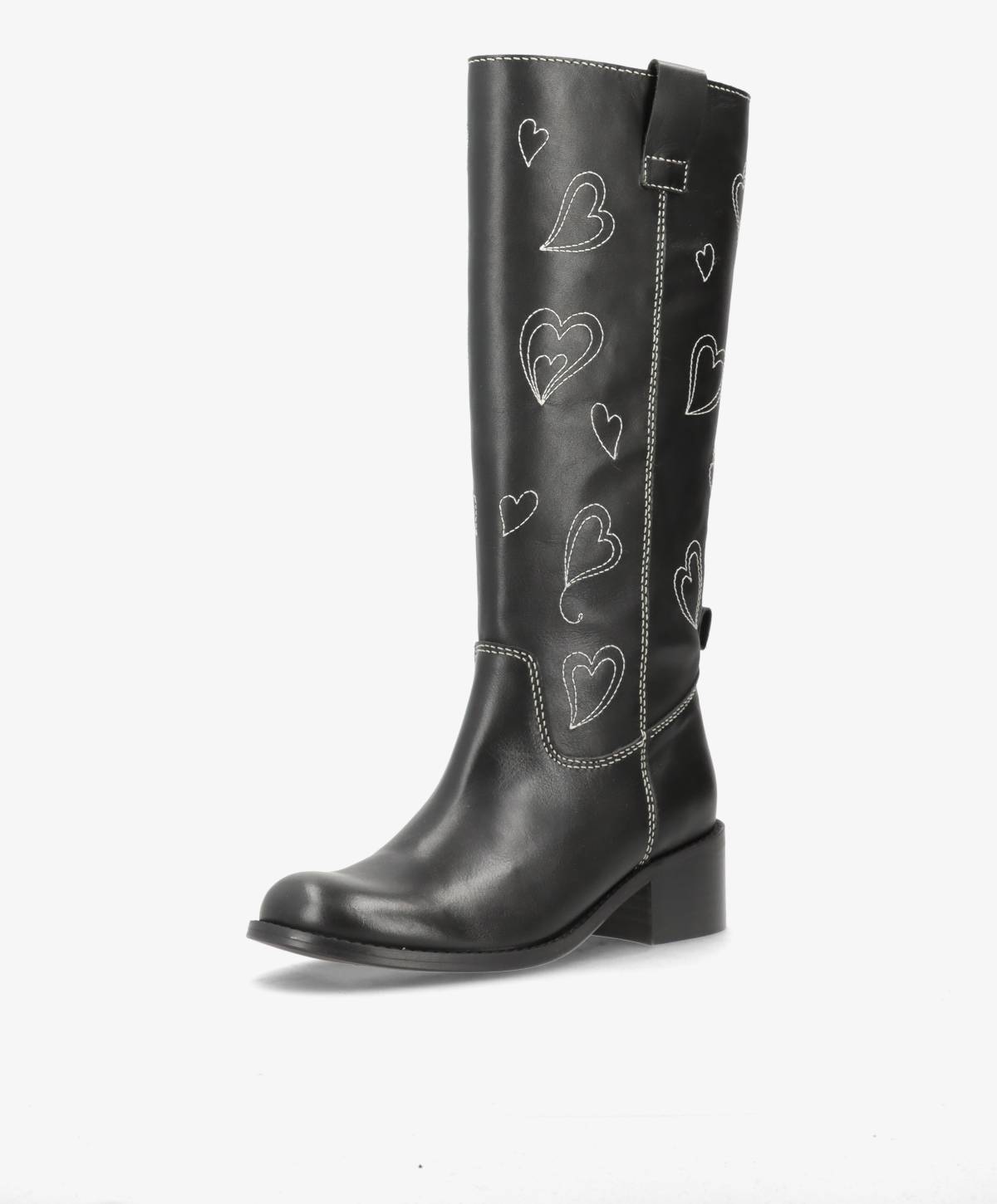 Oplev den smukke HEARTSCAPE støvle i sort læder, der kombinerer et råt udtryk med et feminint twist. Denne støvle har et unikt design med fine, hvide hjertedetaljer, der fremhæver den eksklusive kvalitet. Det sorte læder giver et elegant look, mens den solide hæl sikrer både komfort og stil i din hverdag.