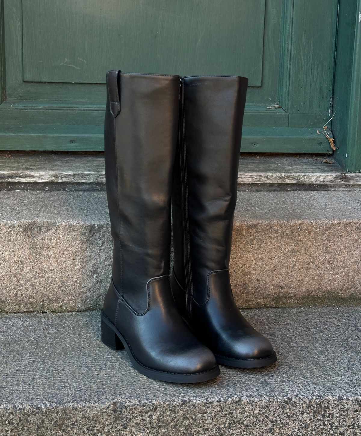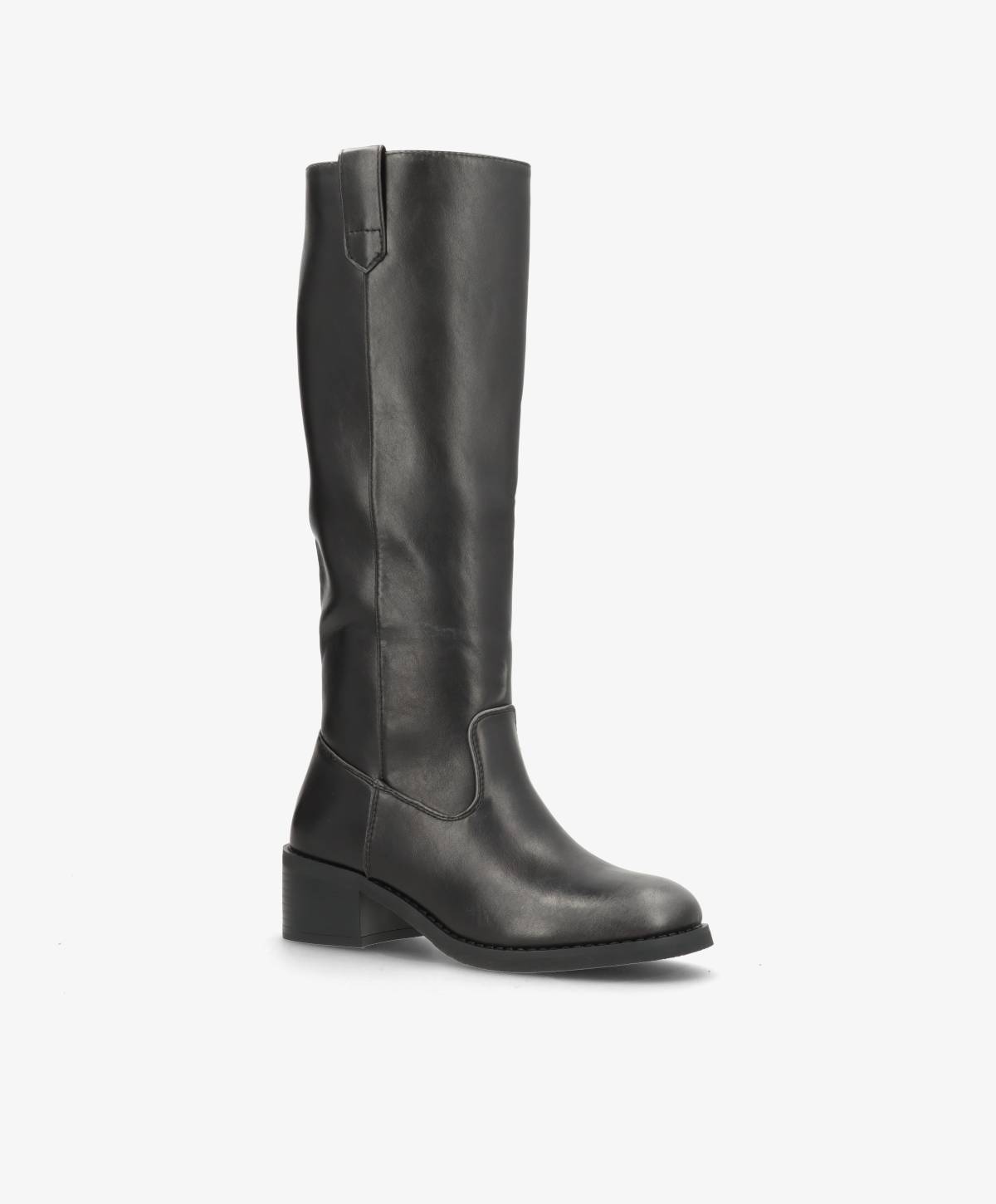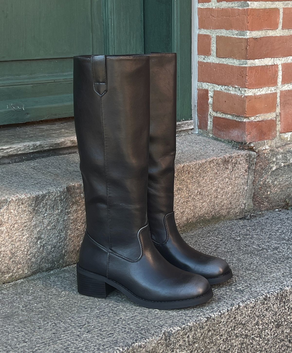 HELDI C371 er en elegant lang støvle i sort imiteret læder, der kombinerer klassisk design med moderne komfort. Den glatte overflade og enkle linjer giver støvlen et stilrent udtryk, mens den solide blokhæl og fleksible sål sikrer en behagelig pasform hele dagen.