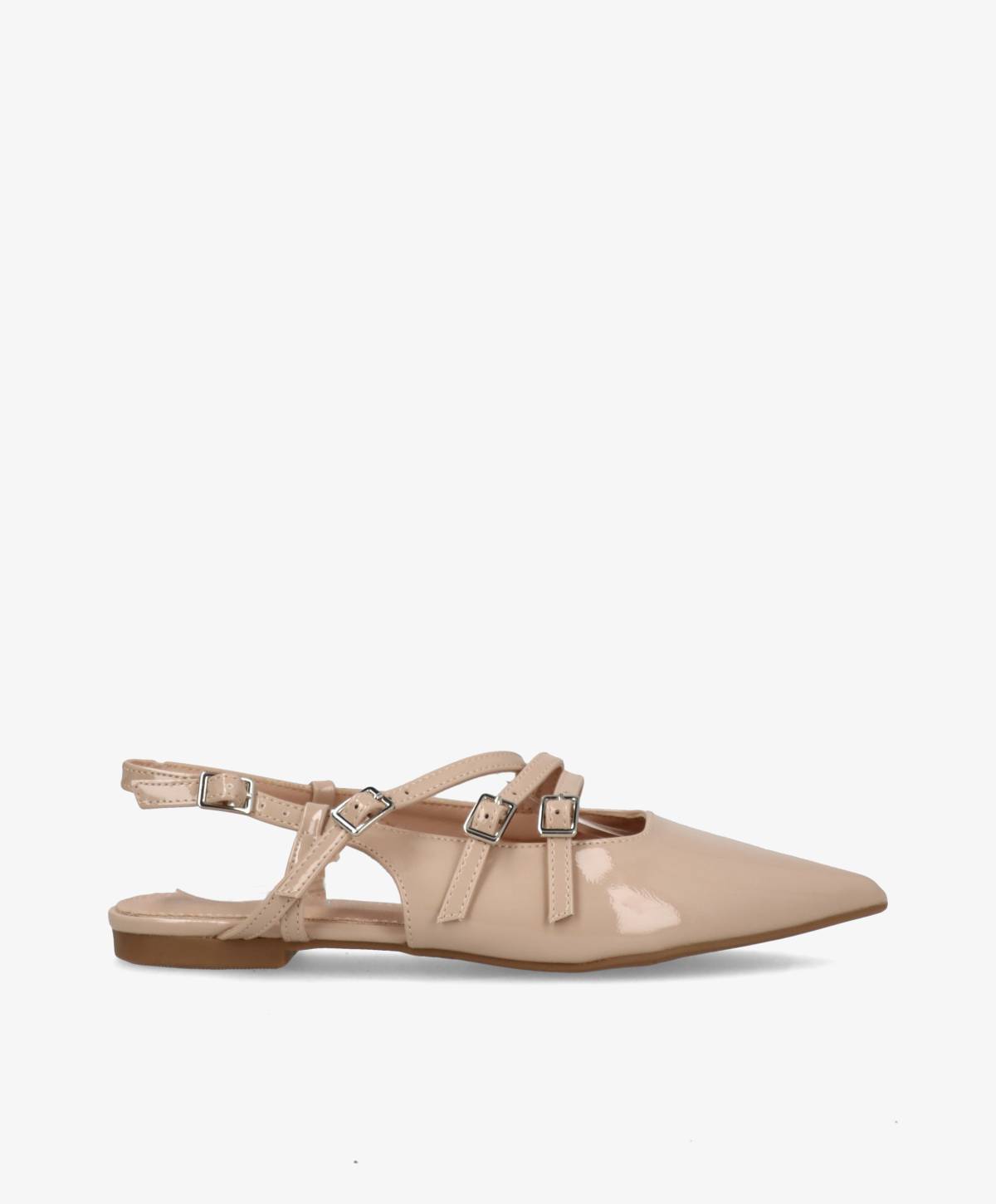 LAVAUR ballerinaen i blankt beige lak kombinerer femininitet med et edgy twist. De slanke stropper med små spænder og den spidse snude giver et sofistikeret look, mens den åbne hæl med justerbar rem sikrer en behagelig pasform. Det skinnende finish tilføjer et eksklusivt touch og gør skoen oplagt til både hverdagsbrug og mere polerede outfits.
