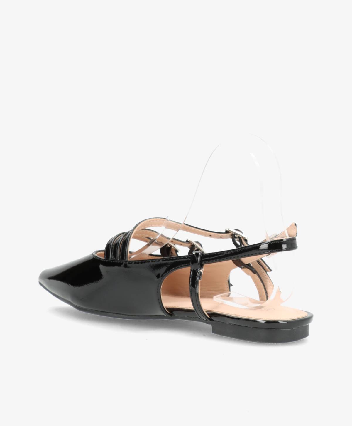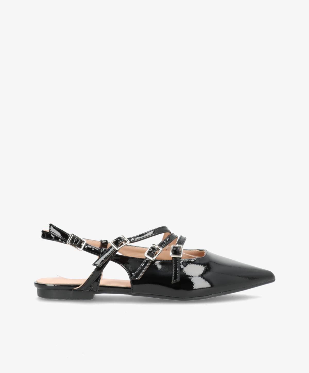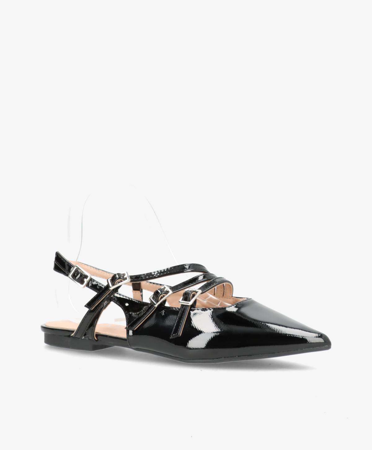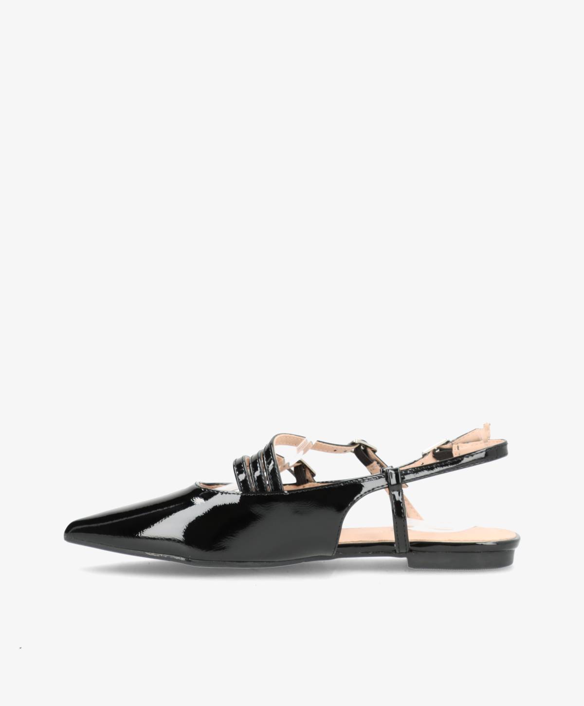 LAVAUR ballerinaen i blankt sort lak kombinerer femininitet med et edgy twist. De slanke stropper med små spænder og den spidse snude giver et sofistikeret look, mens den åbne hæl med justerbar rem sikrer en behagelig pasform. Det skinnende finish tilføjer et eksklusivt touch og gør skoen oplagt til både hverdagsbrug og mere polerede outfits.