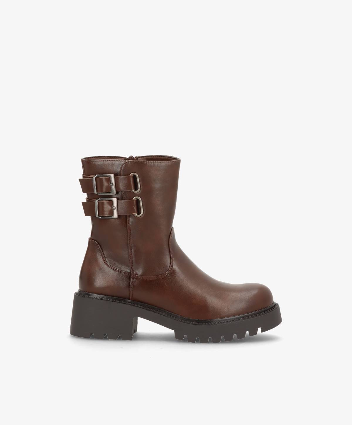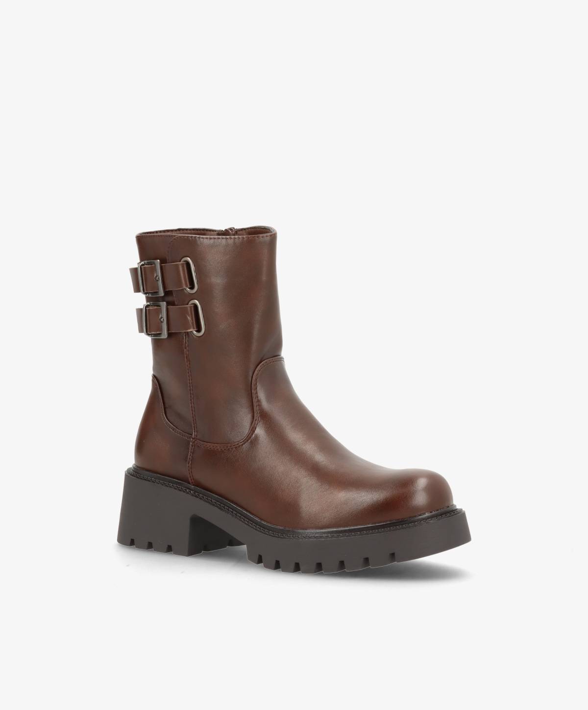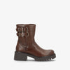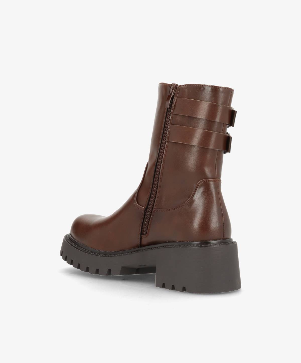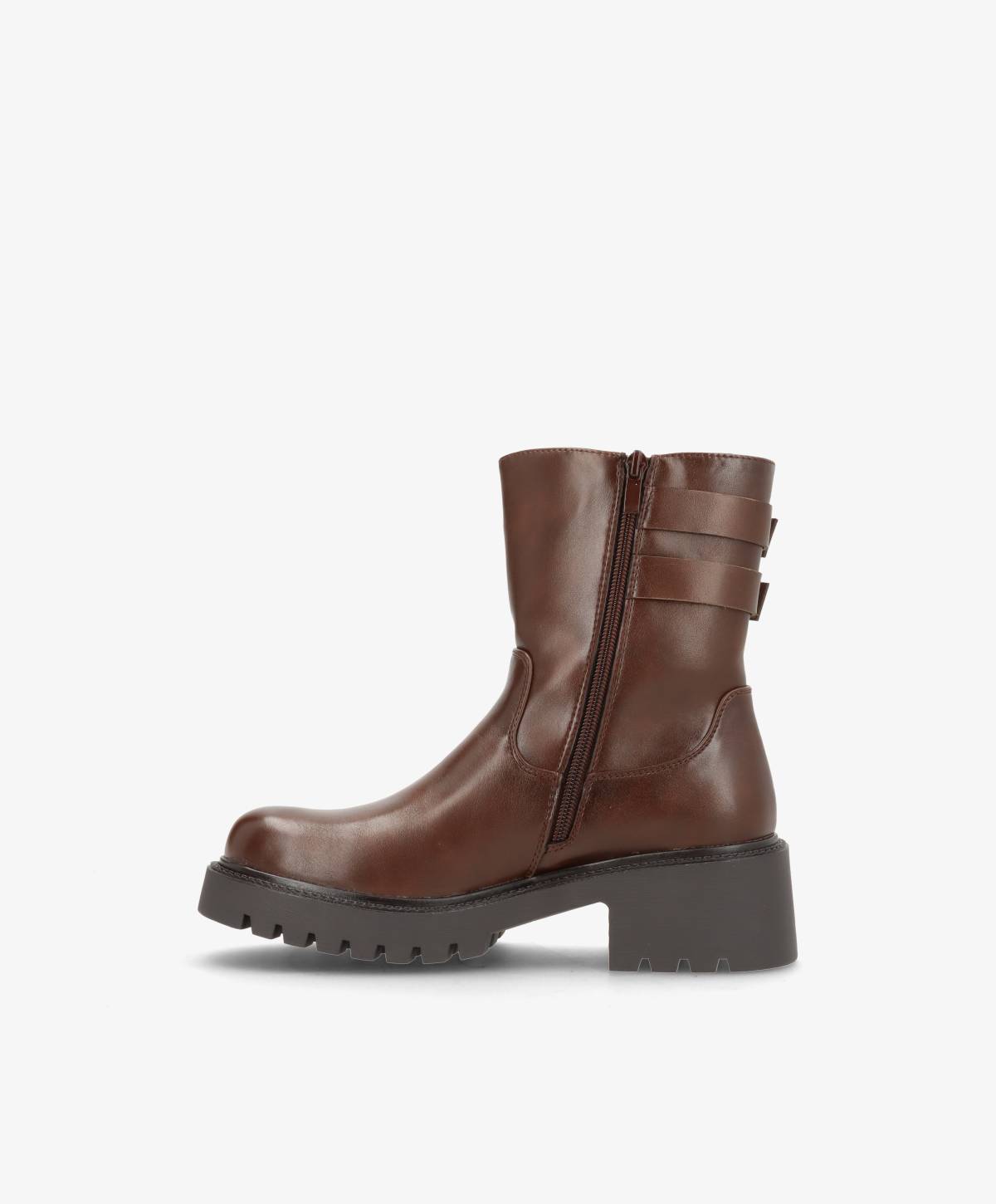 LEXA er en moderne bikerstøvle med masser af attitude. Den er lavet i brun imiteret skind og designet med dobbelte spænder i siden, som giver et edgy og stilfuldt udtryk. Den kraftige sål med groft mønster og den stabile blokhæl sikrer både komfort og et fast greb i underlaget.