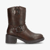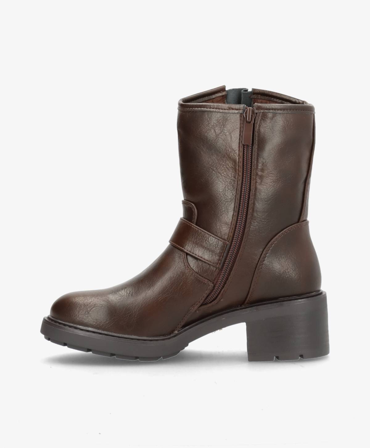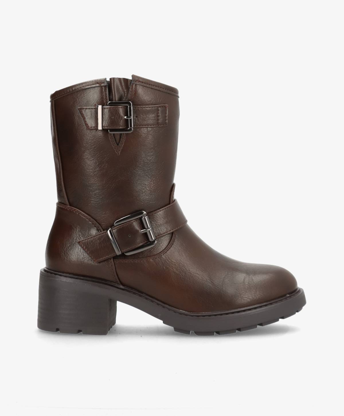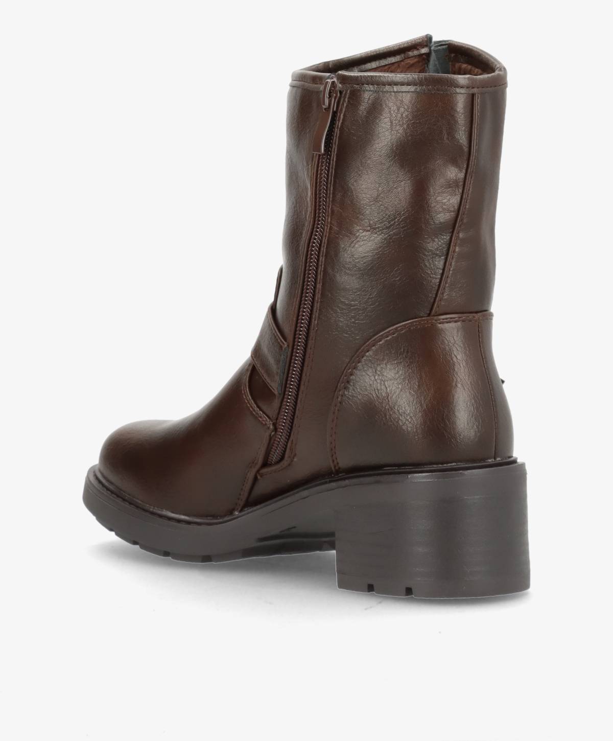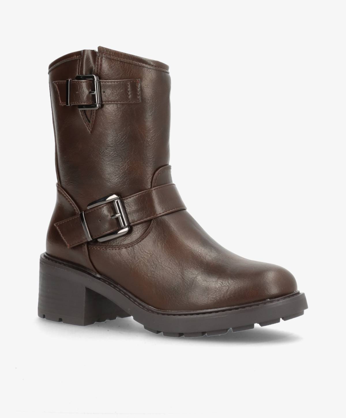 Denne støvle i imiteret skind har et robust og stilfuldt design, der er perfekt til både hverdag og fest. Den fås i både sort og brun, hvilket gør den alsidig og nem at matche med forskellige outfits. Støvlen er udstyret med dekorative spænder og en solid hæl, der giver ekstra højde og komfort. En praktisk lynlås på indersiden sikrer, at støvlen er nem at tage af og på. Den slidstærke gummisål giver et godt greb, hvilket gør støvlerne velegnede til hverdag.