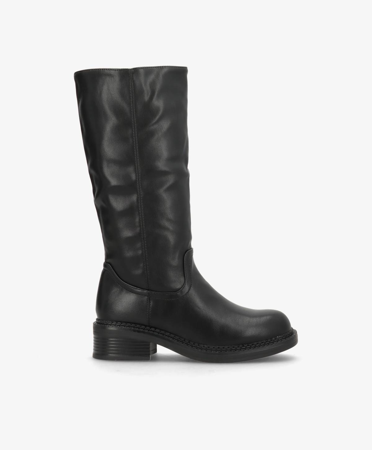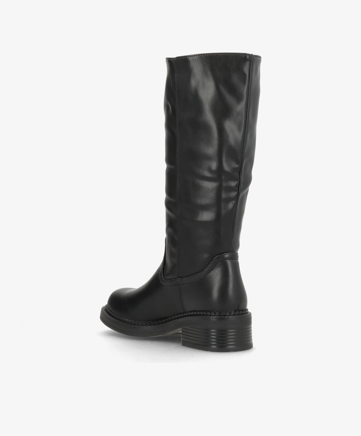 NAYA er en knæhøj støvle i flot, sort imiteret læder, der kombinerer enkelhed med karakter. Det rene design med rund snude og diskrete syninger gør den let at style med både strikkjoler, jeans og leggings. Den brede hæl og solide ydersål sikrer stabilitet og komfort til hverdagens mange skridt.