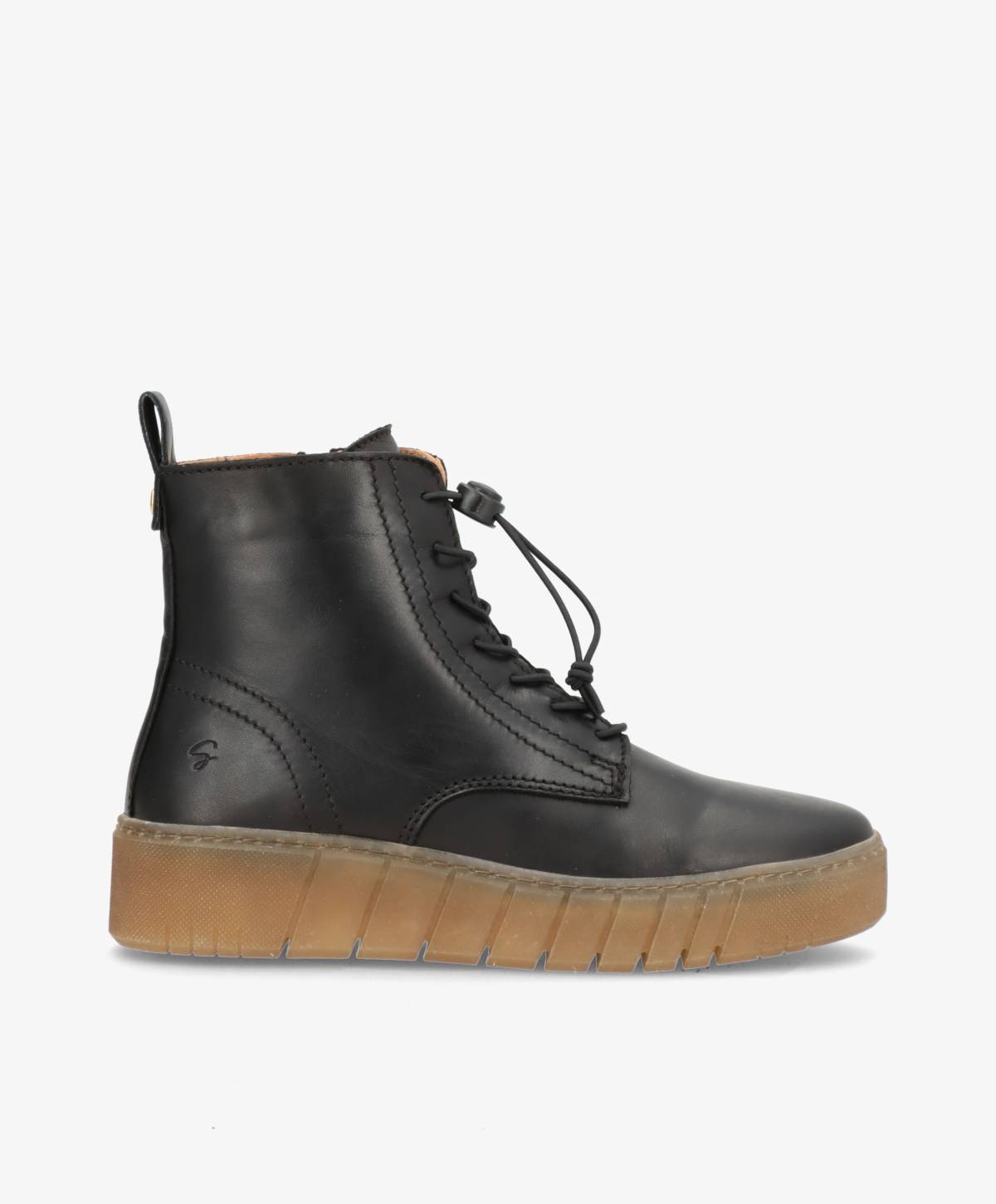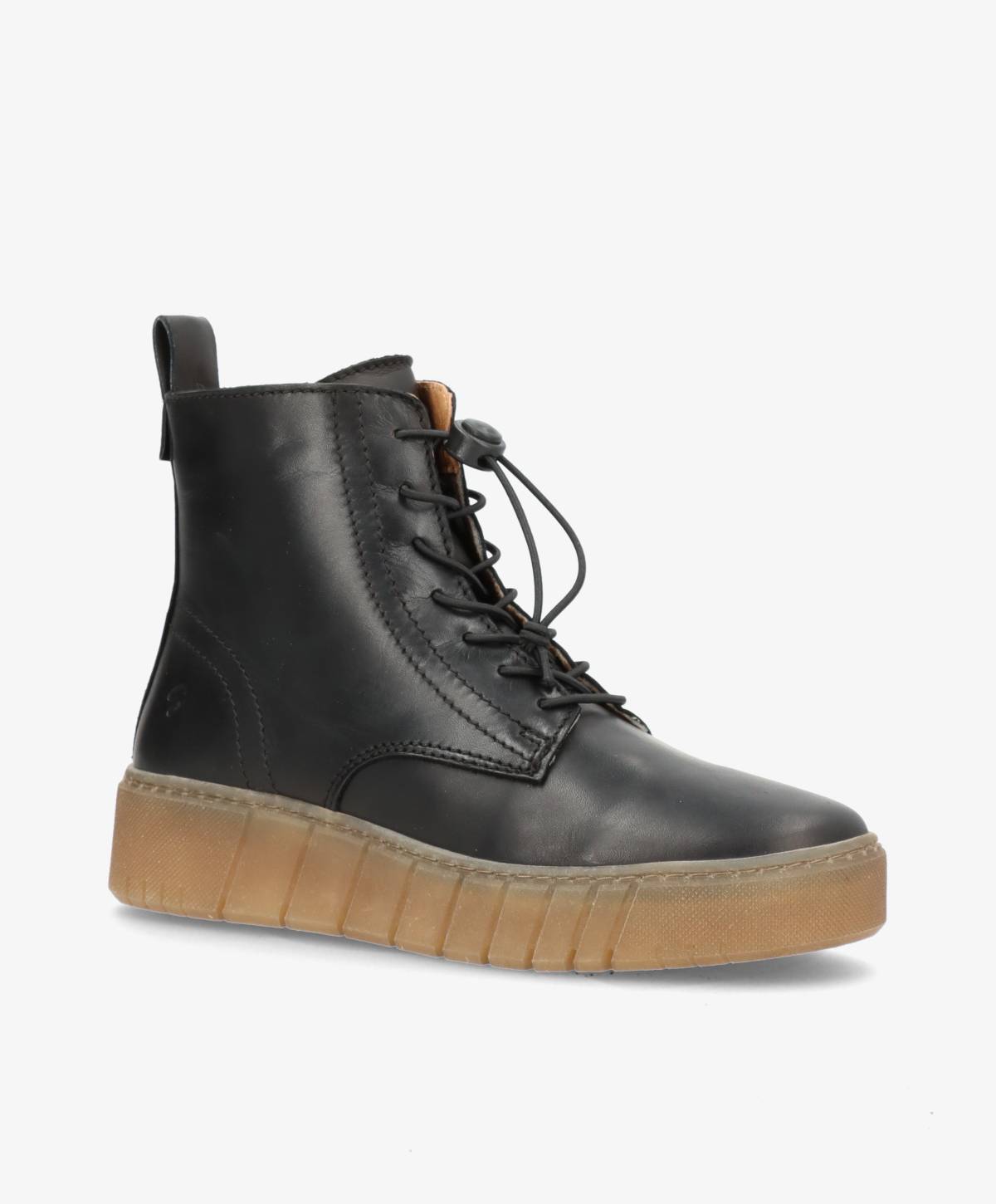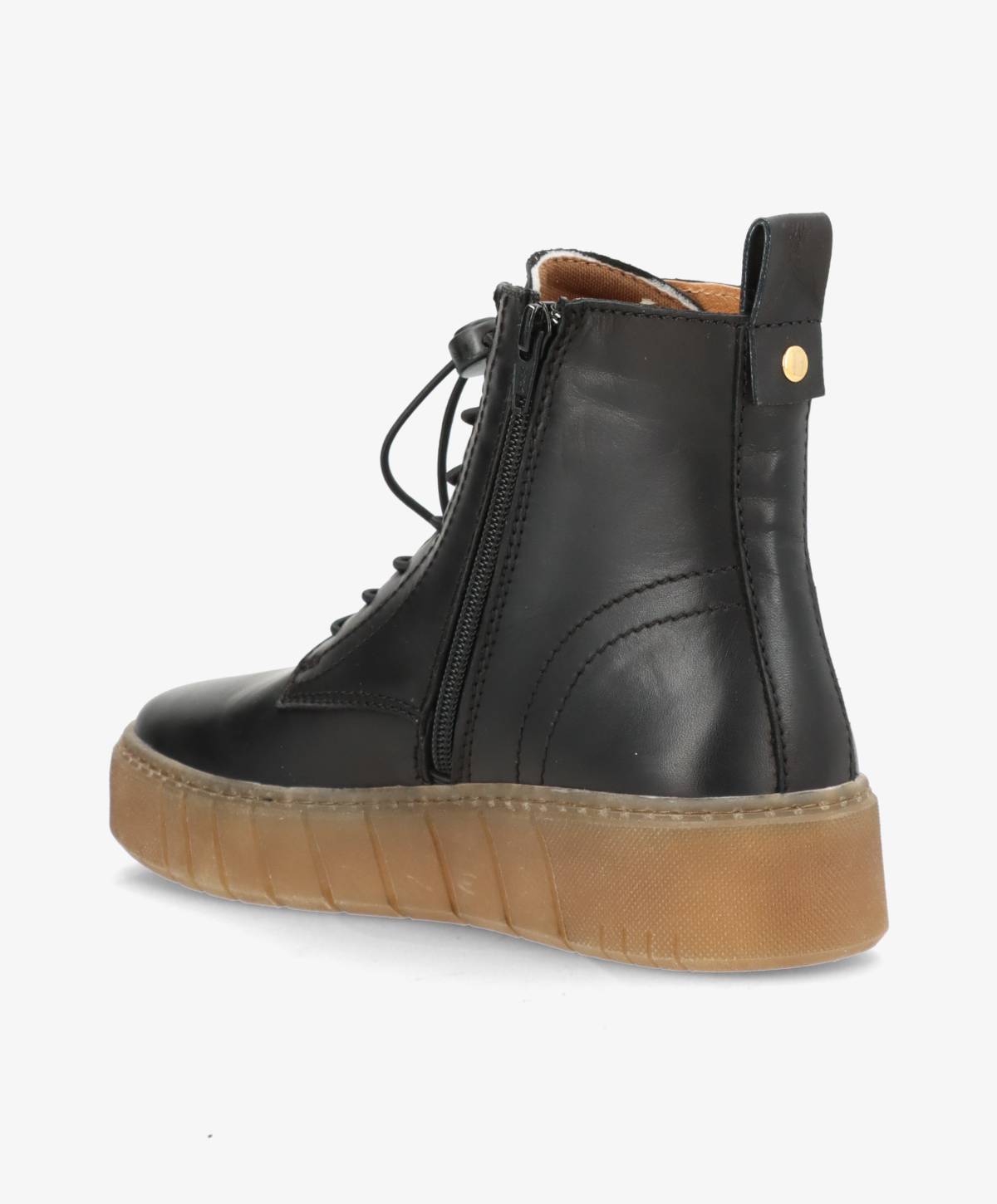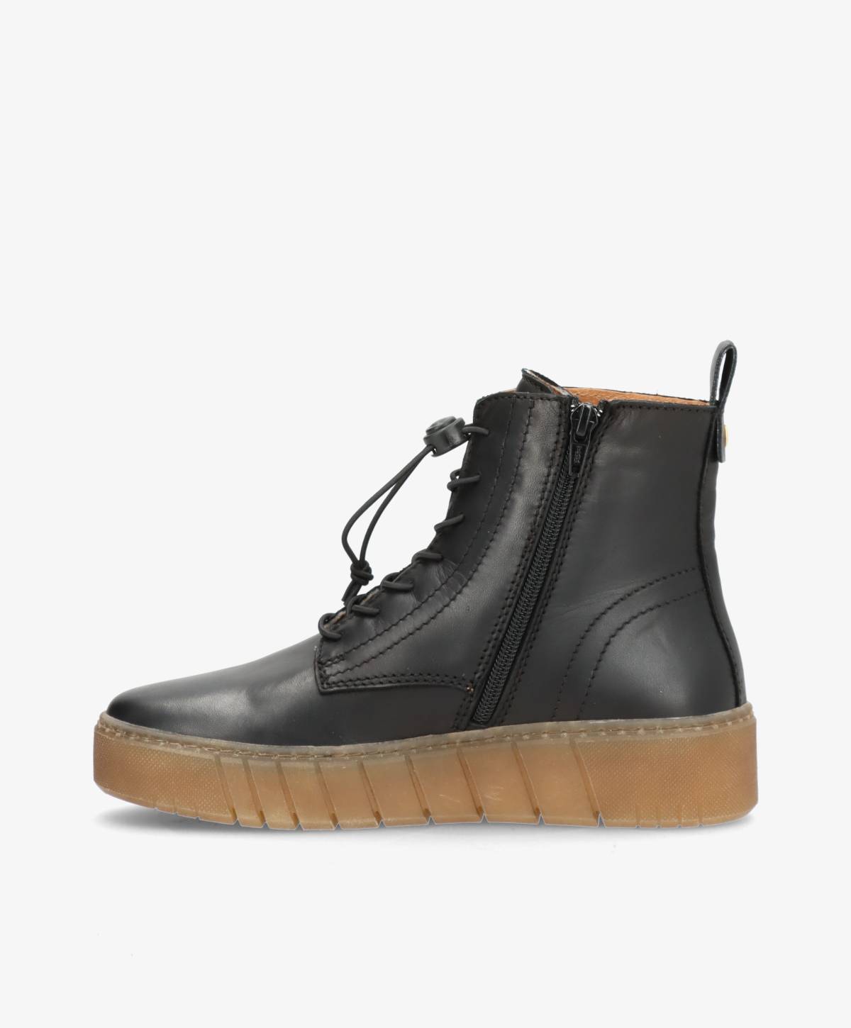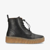 MOOVED LACE i sort læder fra Shoedesign Copenhagen kombinerer moderne urban attitude med praktisk komfort. Med sit høje skaft, lynlås i siden og elastisk snørelukning er støvlen nem at tage af og på, samtidig med at den sidder tæt og sikkert om foden. Den kontrastfarvede gummisål tilfører et sporty look og giver masser af stødabsorbering til hverdagsbrug.