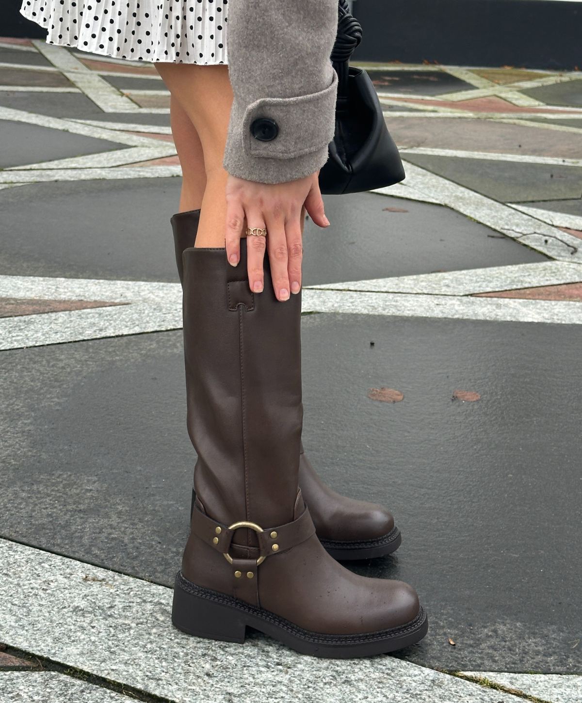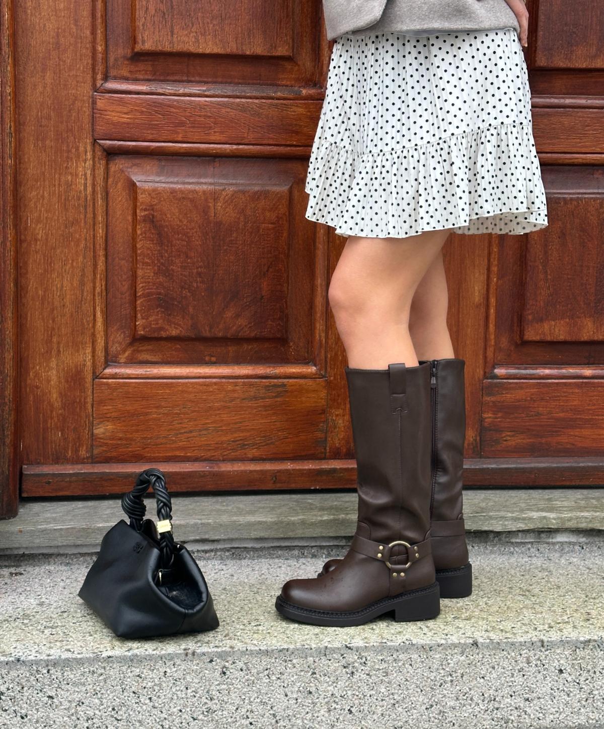 Her får du en lang brun støvle, der kombinerer varm farvetone, klassiske detaljer og komfort til hverdagen. YAS LQ-137 i brun er skabt med en elegant biker-inspireret rem og messingfarvede metalnitter, der giver et moderne og eksklusivt udtryk. Den brede hæl og stabile sål gør støvlen ideel til både travle dage og outfits, der kræver lidt ekstra kant.
